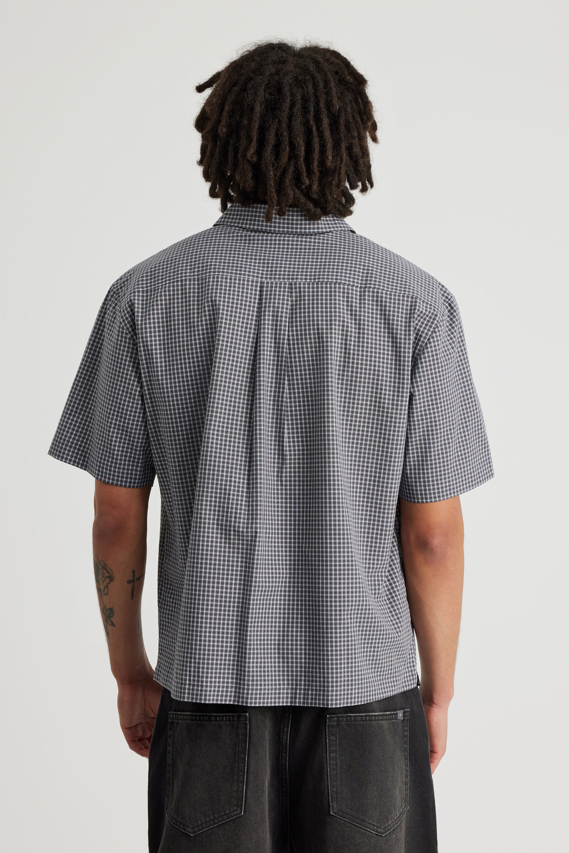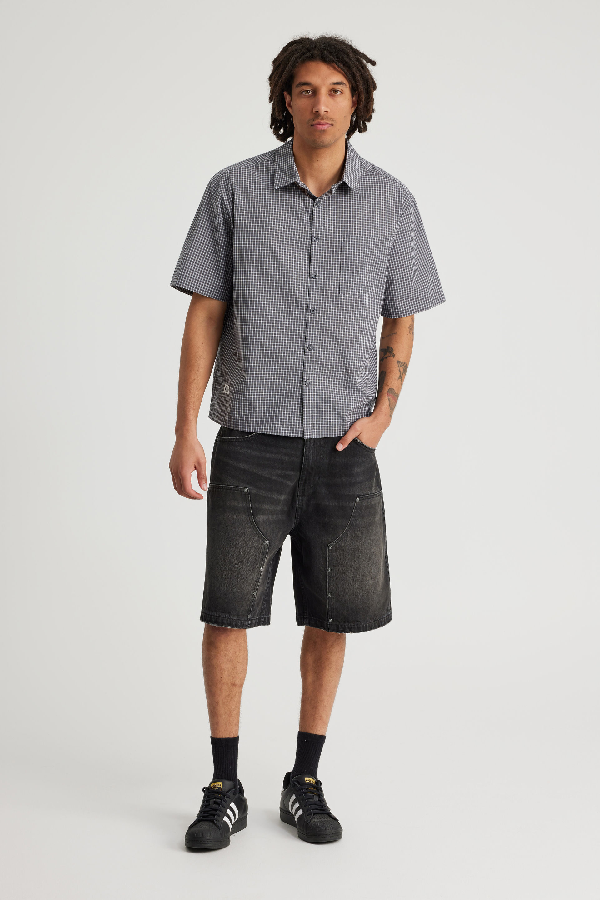 Level up your streetwear game with this must-have classic button-up shirt.  A fresh, boxy fit that’s designed to keep you looking effortless all day. This short sleeve shirt hits just right with its cropped length — giving you that on-point, modern silhouette. Whether you’re layering it over a tee or wearing it solo, this button-up shirt is the finishing touch for every fit.