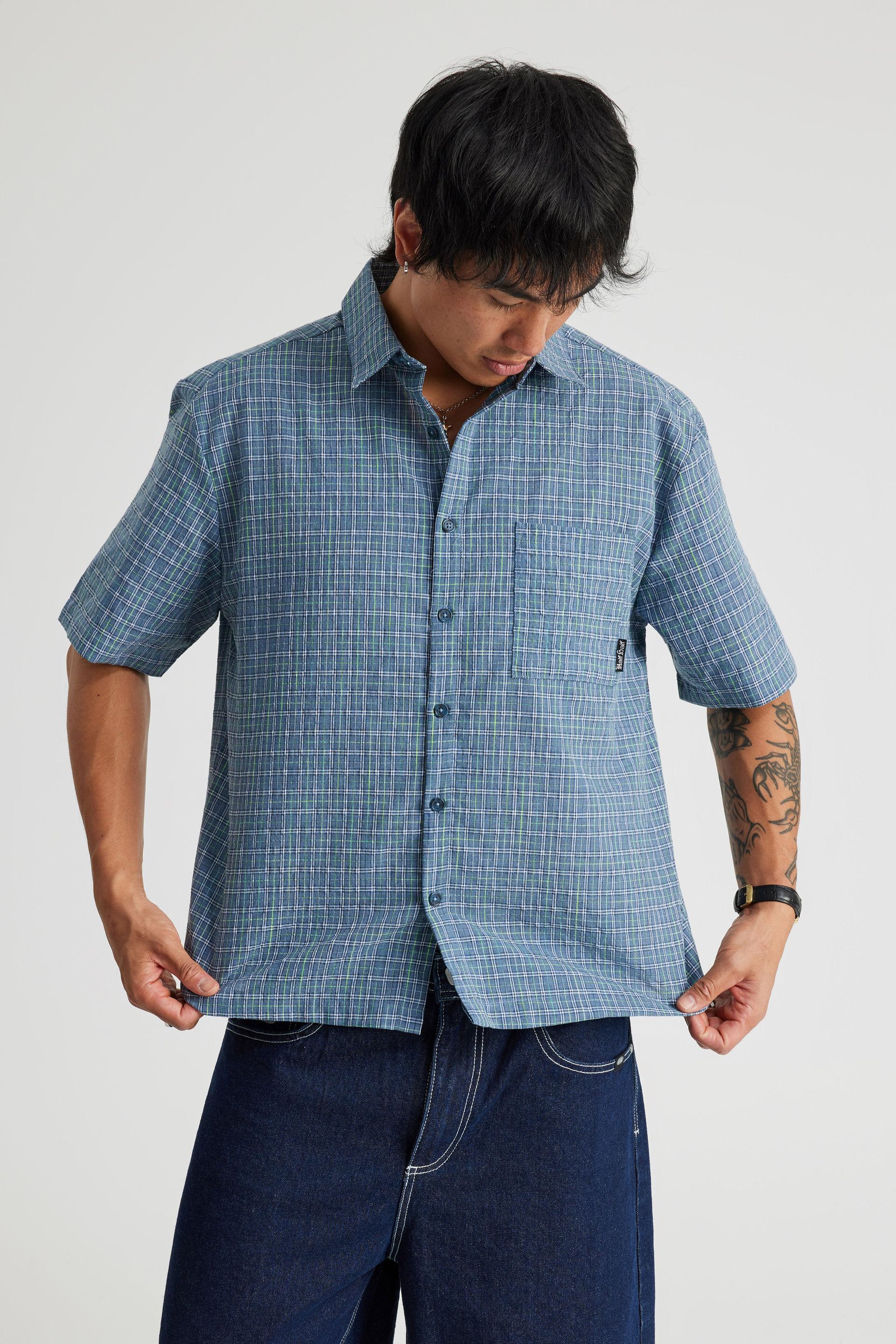 Level up your streetwear game with this must-have classic button-up shirt. A fresh, boxy fit that’s designed to keep you looking effortless all day. This short sleeve shirt hits just right with its cropped length — giving you that on-point, modern silhouette. Whether you’re layering it over a tee or wearing it solo, this button-up shirt is the finishing touch for every fit.