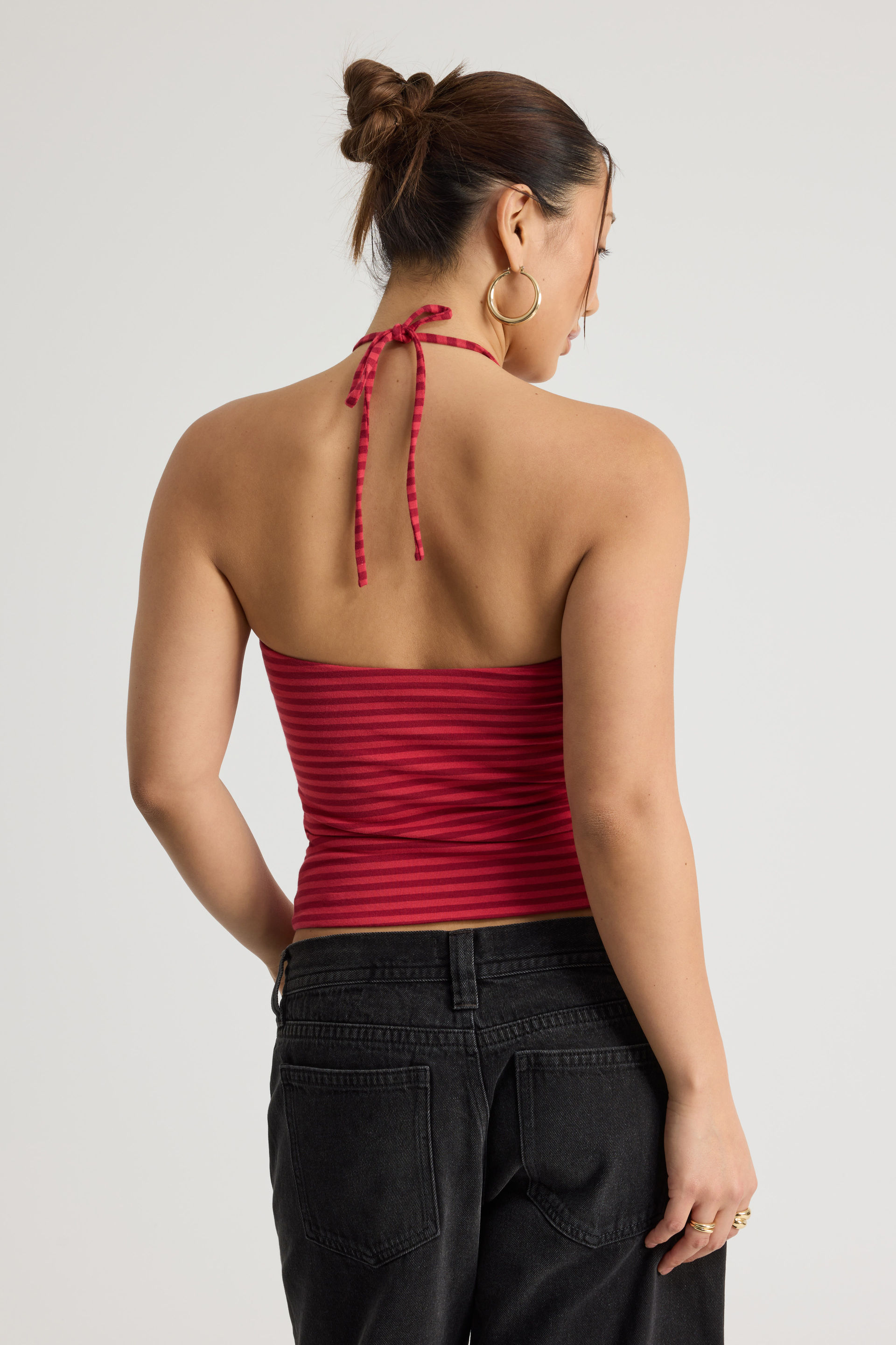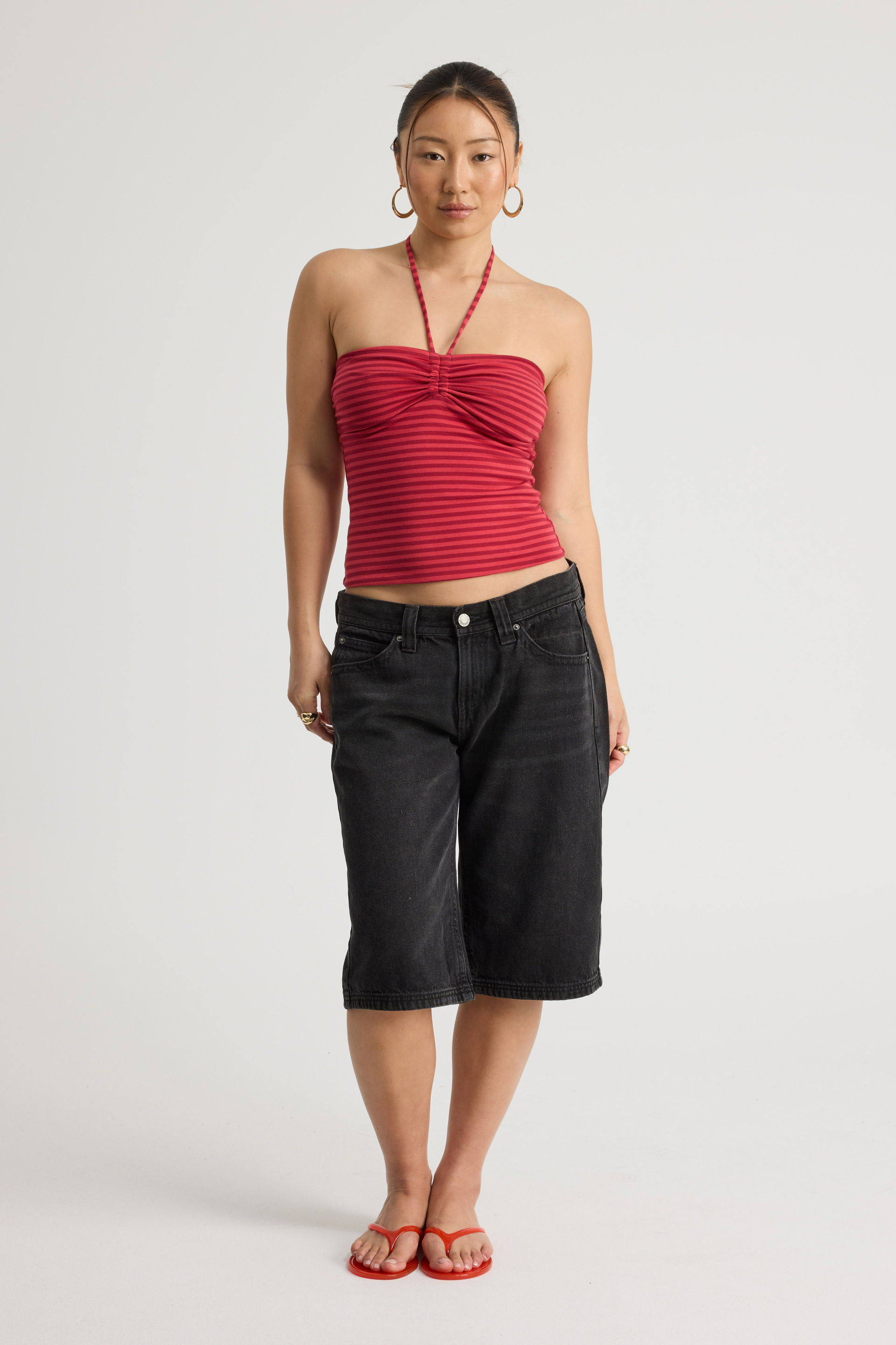 Ruched Front Bandeau Halter, RANCH RED STRIPE