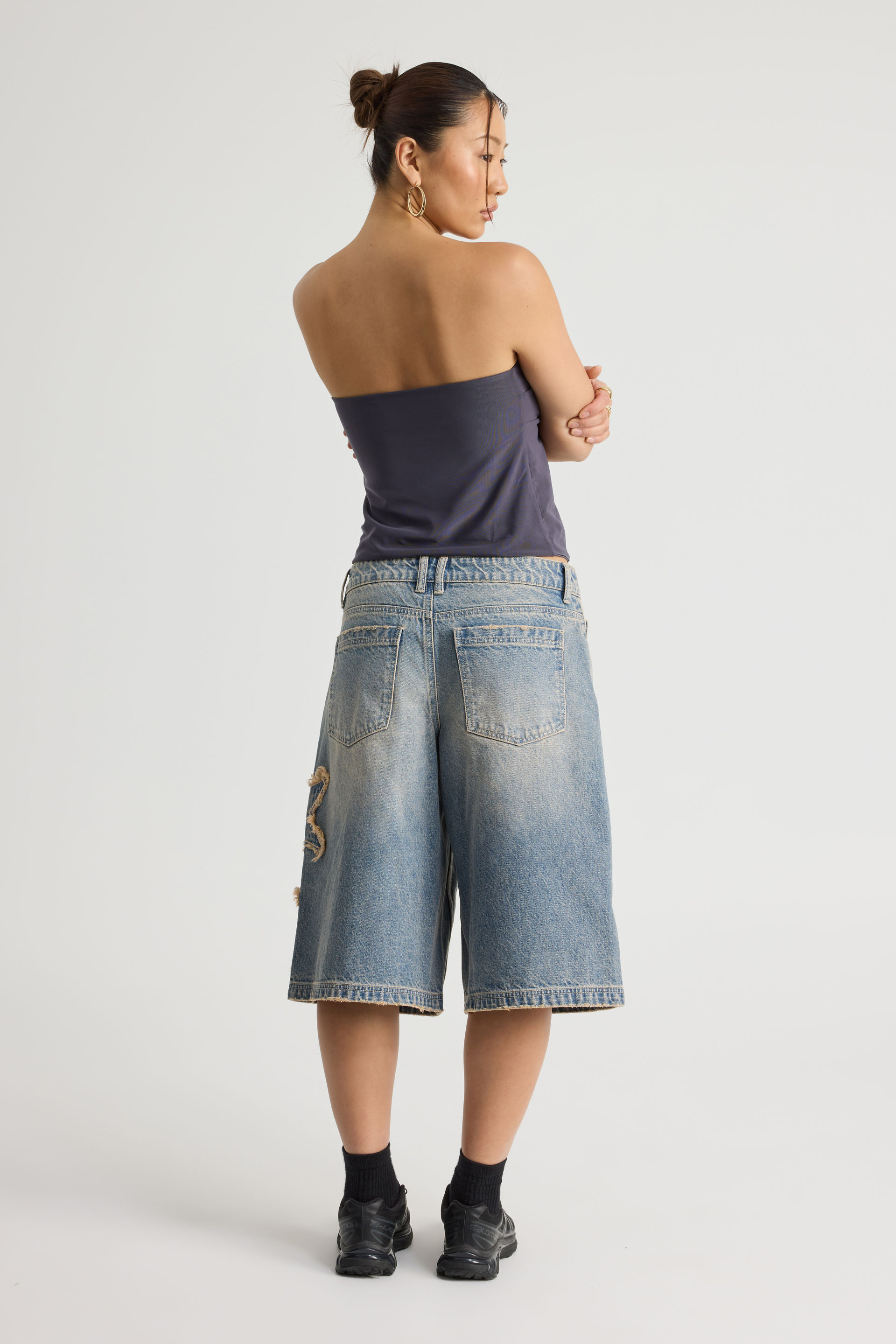 An extra relaxed silhouette that cuts off just below the knee. Featuring a mid rise and unique fashion embroidery across select fits.